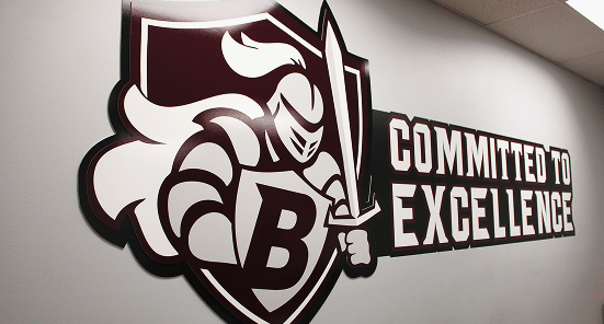 To create a cohesive look across all athletic facilities and boost team spirit, we also refreshed the area outside the athletic offices, located adjacent to the school’s second indoor gym. This phase of the project focused on clean, high-impact branding, including two large vinyl wall decals featuring the school tagline and “B” icon. These were printed on 3M IJ180cv3 with 3M 8520 Matte Laminate, resulting in a smooth finish that would also help prevent scuffs . along with a rigid PVC sign mounted above the athletic office. The result clearly identifies the athletics department while reinforcing the school’s brand and making it easy for visitors and students to find the information they need.